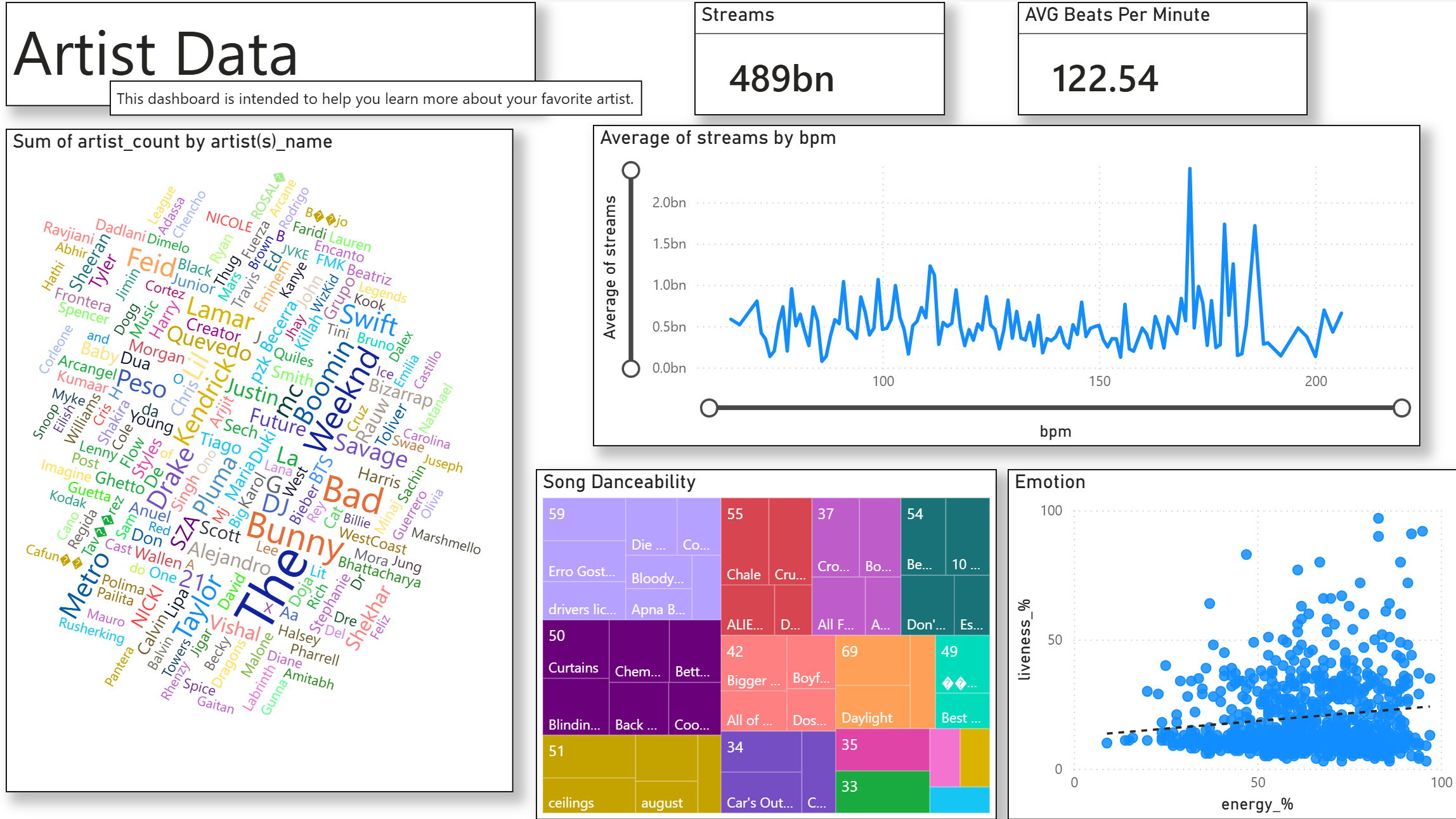 - Spotify Data: Created visualizations of music listening patterns, genre trends, and artist analytics.