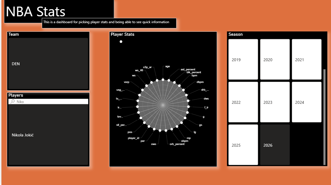 - NBA Statistics: Built interactive dashboards to compare player performance metrics, team standings, and historical trends.